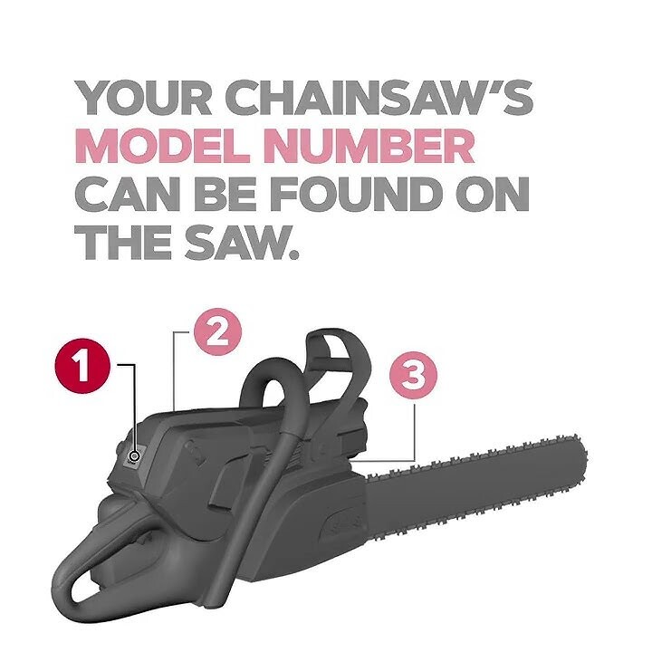 You can find your model number in one of three places on most chainsaws. On the back, top or front of the saw there should be a label that shows the 5-7 digit model number.